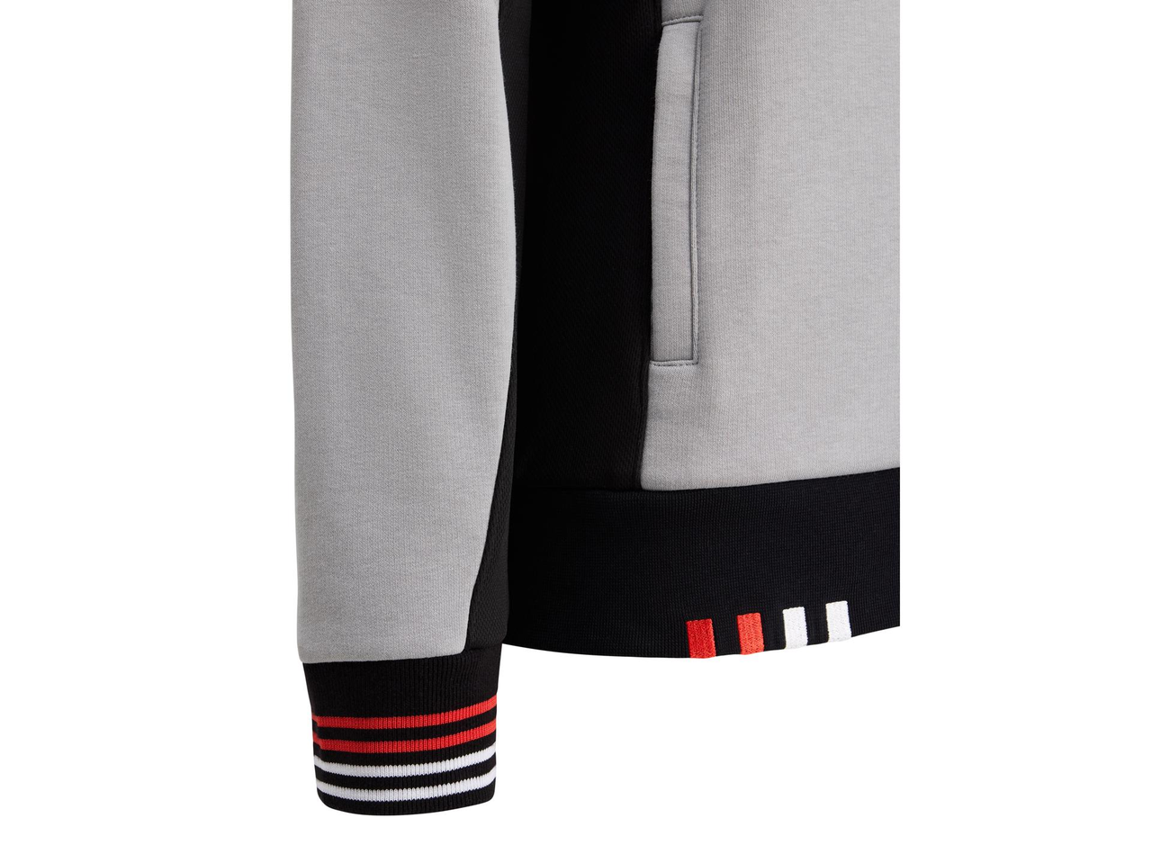 • Ribbed sleeve cuffs are banded with red and white