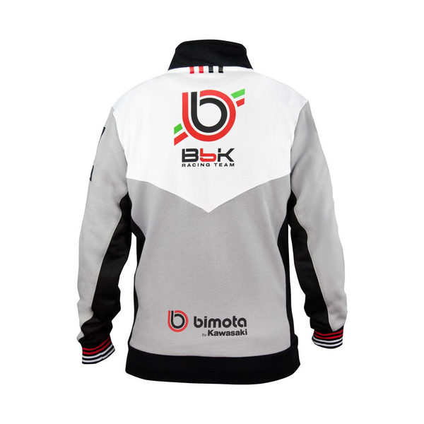 A full-zipped Bimota/BbKRT branded sweater in grey, white and black, with a stand-up collar, customary zipped outer pockets and the sleeve cuffs are banded in red and white. The waist rib boasts with embroidered red and white Bimota markings.