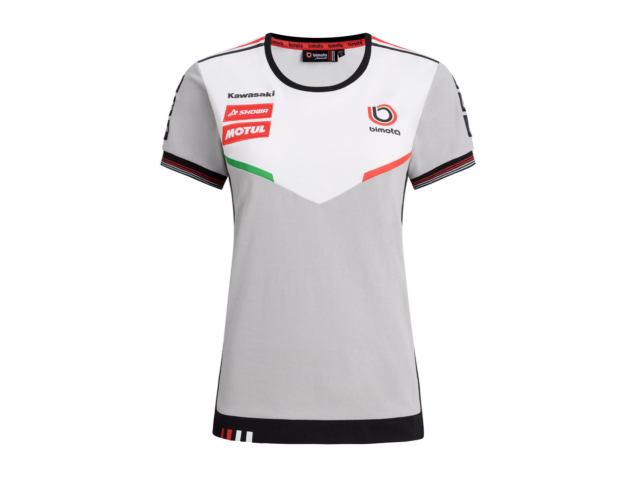 A short-sleeved crew neck t-shirt of which the sleeve edge is cuffed with a red and white banded rib and the hem features the red and white Bimota markings.