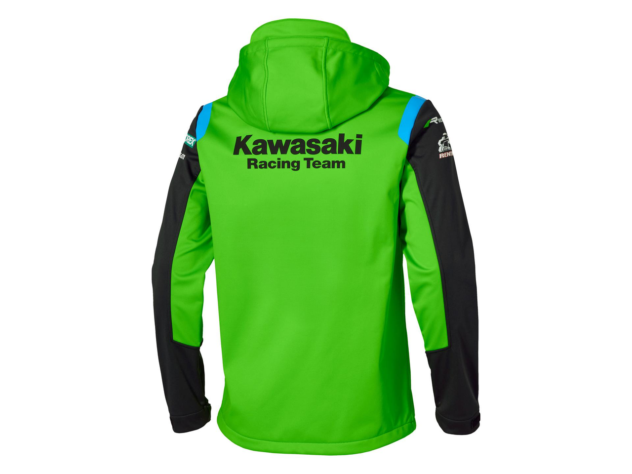 Softshell jacket in Kawasaki MXGP Team colors with detachable hood, zipped outer pockets and adjustable sleeve cuff. Extended size range with x-small to accommodate unisex fit.