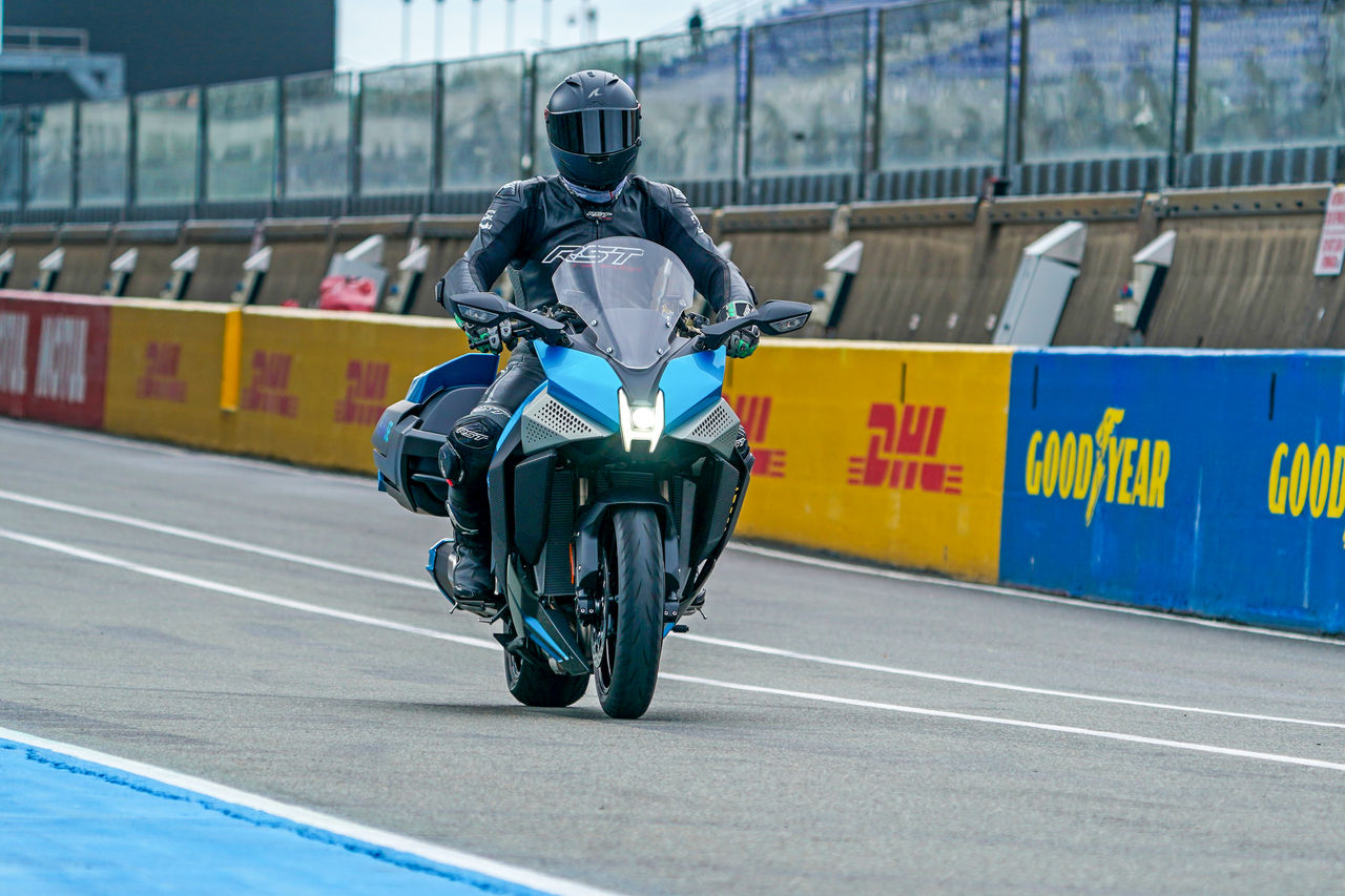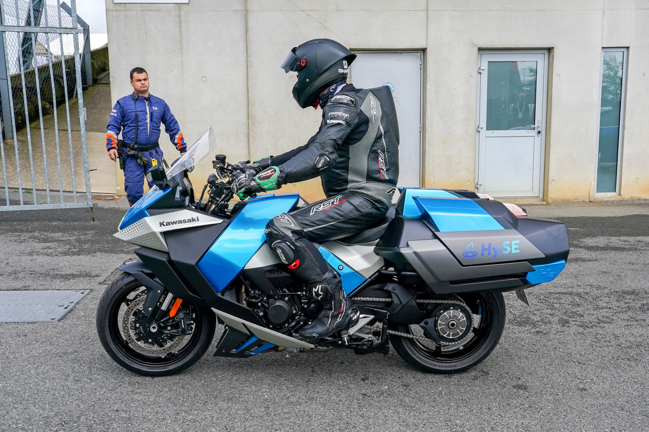 Circulating for two laps in the expert hands of Matthias Hoeppner, a Kawasaki test rider, the machine relies of twin hydrogen fuel tanks for motive power via a modified Ninja H2 four-cylinder, supercharged engine.