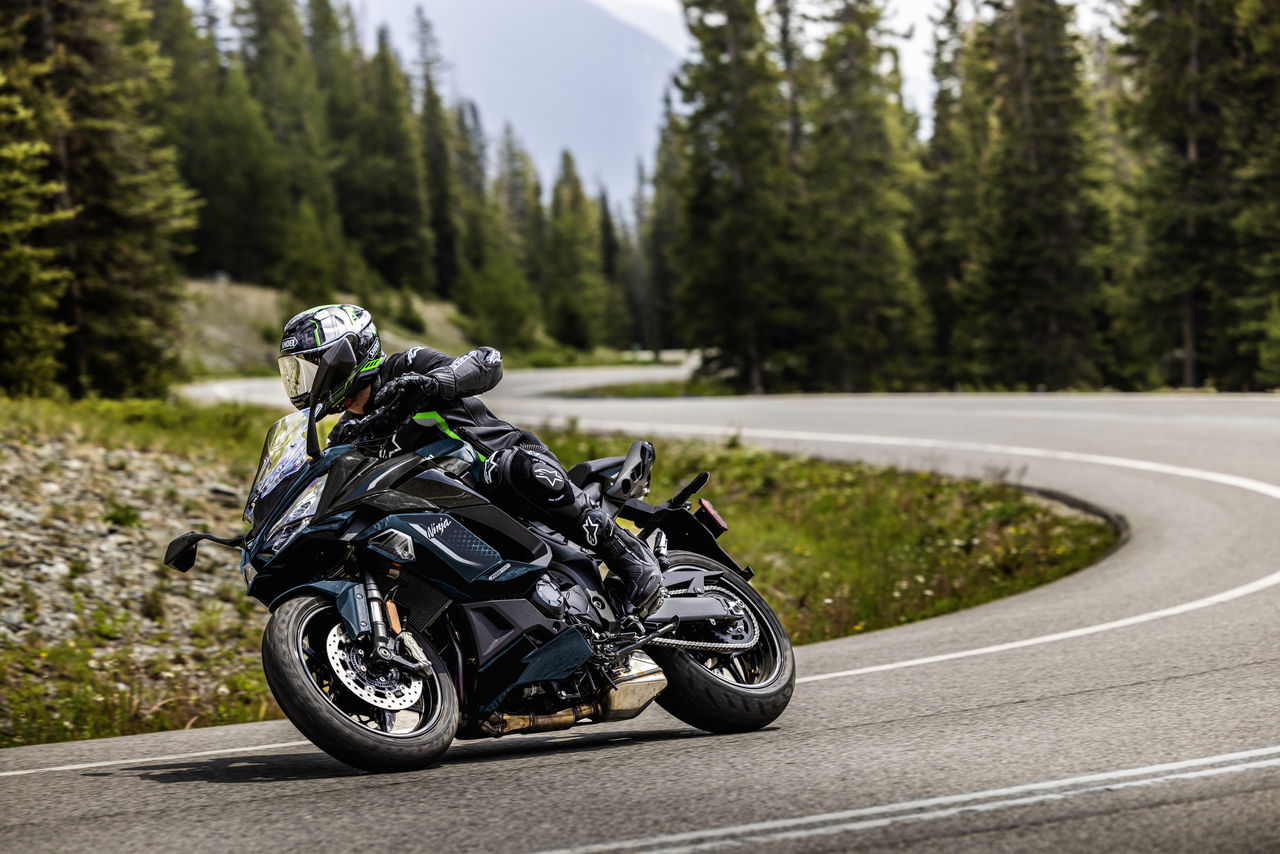 Much has been written about the Ninja H2 SX with its continent shrinking 147.1 kW {200 PS} 998cc engine complete with an in-house designed and manufactured integrated balanced supercharger. Of course, riding is believing and the rider tech is certainly impressive with dedicated features like Auto Hi-Beam and the ARAS front and rear radar system providing real world benefits. Adaptive cruise control also features plus blind spot detection. Integrated into the 6.5” colour TFT instrumentation is Kawasaki's SPIN Infotainment system.